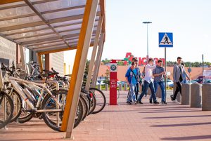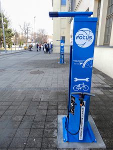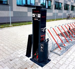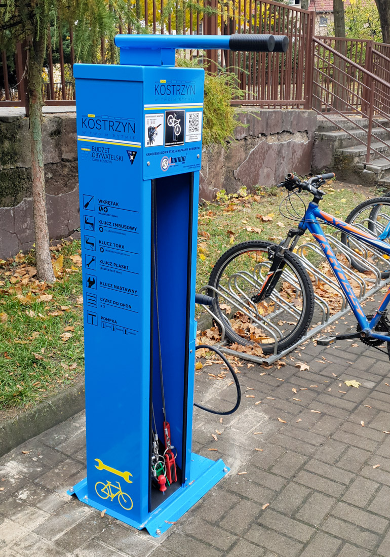 The QR CODE placed on the front of the station allows you to use online publications containing instructions on repairing bicycle faults. Sheet metal elements of the device are fastened with anti-theft screws – the bits for these screws will be handed over to the customer. This model of the station can be additionally equipped with, among others, aluminium waterproof frames, side-or-back bike stand, a pneumatic skateboard holder or E-BIKE bicycle charging module.